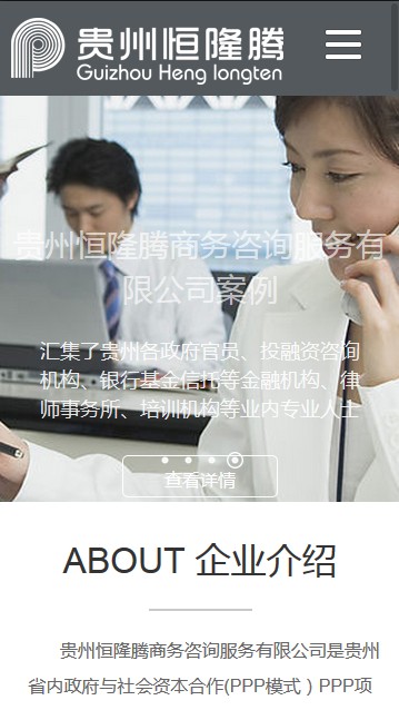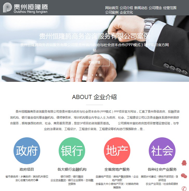 貴州恒隆騰商務(wù)咨詢服務(wù)有限公司是貴州省內(nèi)政府與社會資本合作(PPP模式)PPP項目官方網(wǎng)站,匯集了貴州各級政府、投融資咨詢機構(gòu)、銀行基金信托等金融機構(gòu)、律師事務(wù)所、培訓(xùn)機構(gòu)等業(yè)內(nèi)專業(yè)人士,為政府、社會、工程建設(shè)公司以及各金融體系提供橋梁綜合服務(wù),擁有雄厚的政府、社會、商務(wù)服務(wù)資源,是您 3P項目的咨詢服務(wù)首選。